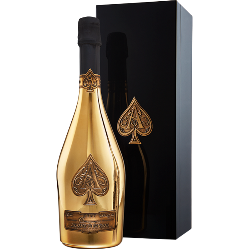 Champagne di grande prestigio, l'Armand De Brignac Gold fa parlare di sé già dal packaging, che lo vuole custodito all'interno di un'elegante scatola nera con l'inconfondibile asso di picche in oro. La bottiglia, anch'essa rivestita in oro secondo un rito manuale, racchiude l'assemblaggio delle migliori uve di Chardonnay, Pinot Noir e Pinot Meunier, provenienti dai migliori cru di Reims. Tutta la filiera produttiva è realizzata artigianalmente, dalla vendemmia all'etichettatura, contribuendo ad alimentare l'esclusività e la ricercatezza di uno degli Champagne più raffinati al mondo.